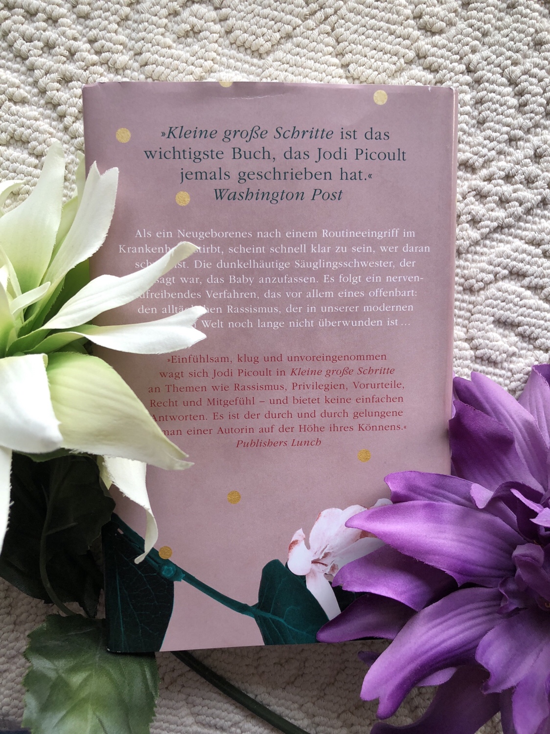 Definitiv eine Buchempfehlung für alle Leser, welche sich an solche Themen heran trauen möchten. Ich habe das Buch mehrmals zur Seite legen müssen, da mich die Geschichte wirklich mit genommen hat. Doch genau solche Geschichten liebe ich genau aus diesem Grund – Geschichten/ Bücher sollen uns bewegen und jeder Autor der dieses schafft, kann mich immer wieder aufs Neue überzeugen. Jodi Picoult mit “ Kleine große Schritte“ ist ein MUSS in jedem Bücherregal.