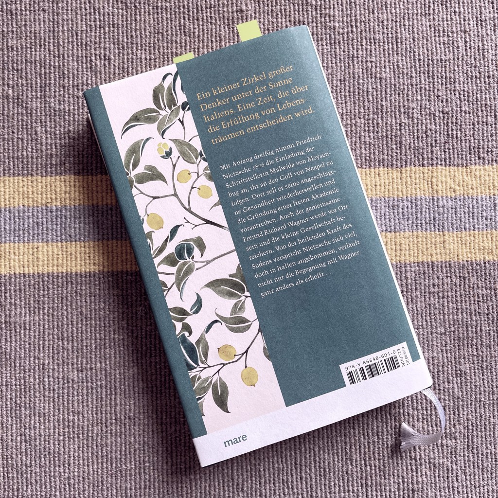 In der Zeit in Sorrent und auf der Reise passieren so einige Dinge. Die Herren verlieben sich, müssen los lassen und verpassen teilweise Chancen. Aus der Idee mit der Akademie wird nichts und alles was bleibt, ist ein tolles Jahr in Sorrent. Die Zeit haben sie genossen. Sie haben die Umgebung erkundet, haben gut gegessen, haben jede Menge philosophiert und das Leben genossen. Aber leider konnten die Herren ihre Gesundheit nicht aufpeppeln. Die spannendste Figur war tatsächlich Malwida von Meysenbug. Sie war beträchtlich älter als die drei Jungen und sah sich auch eher als Mutter der drei. Sie hatte das Bedürfnis ihnen zu helfen und fühlte sich ohne den Besuch auch schrecklich Einsam. Sie tat mir irgendwie leid.